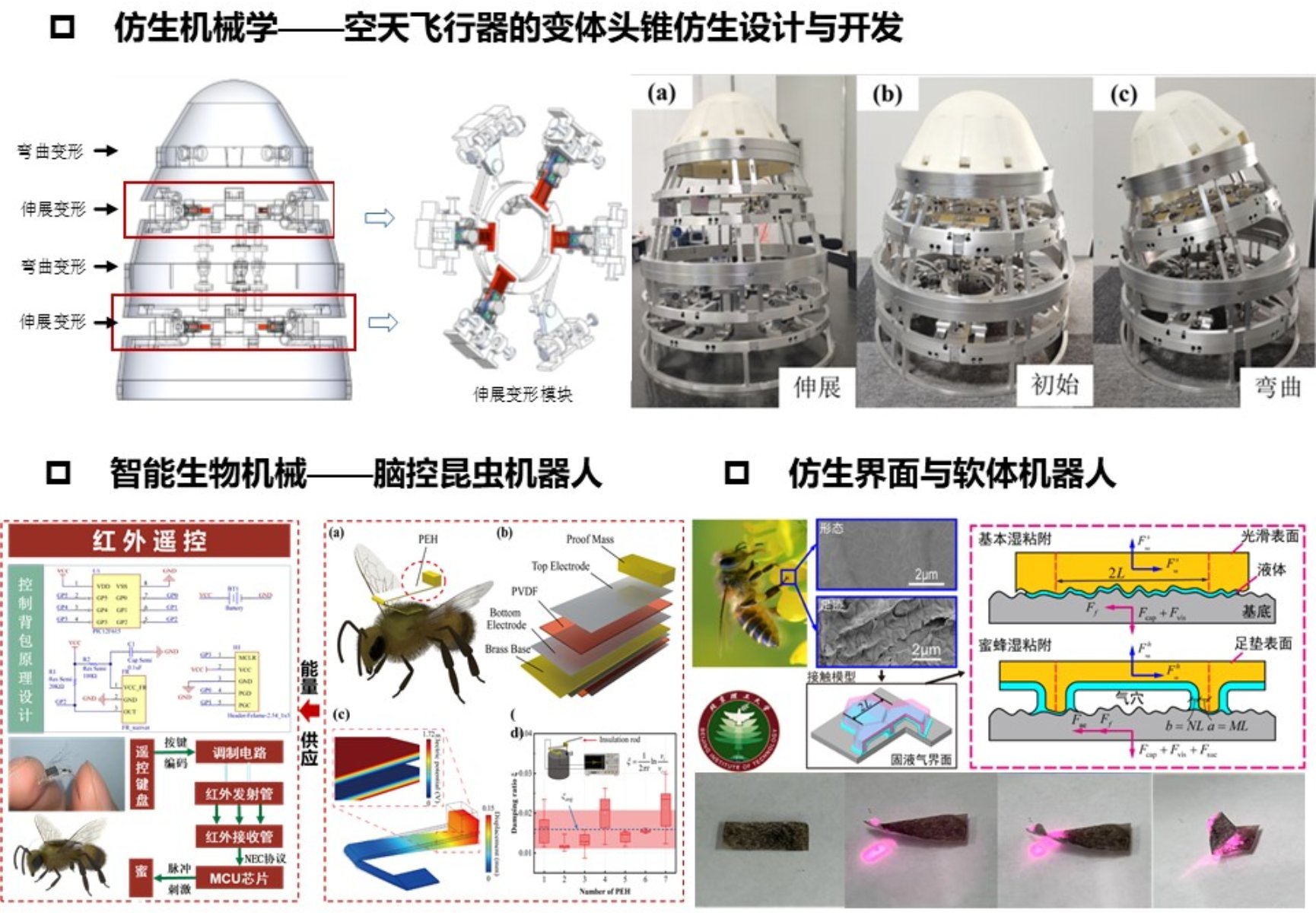 探索自然界生物的特殊结构与行为机理,研发智能仿生机械与机器人系统,具体包含:仿生机械学——探索生物的结构及机理,设计具有相似功能或结构的机械系统,构建动力学模型与控制理论;智能生物机械——开发具有较高生物相容性的材料与结构,探索生物与机械电子智能融合体的设计与开发;仿生界面与软体机器人——研究生物的界面力学行为机理,研制高灵敏度的多场感知响应材料,开展功能表面设计、软体驱动器和智能机器人系统开发。