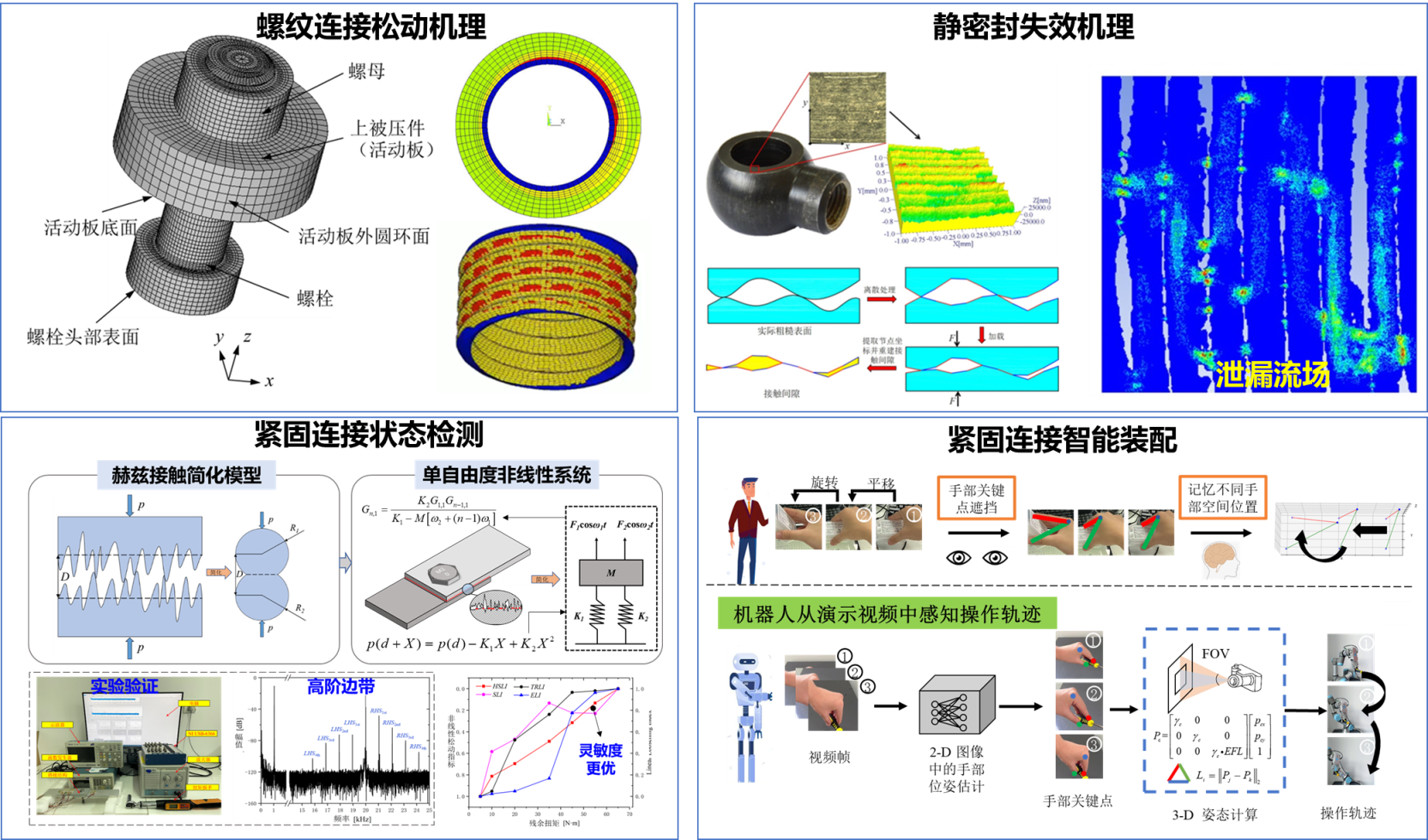 开展了螺纹连接界面松动、咬死等失效机理与结构优化设计研究、管接头/法兰等密封面泄漏机理与工艺调控方法研究、基于超声的紧固连接状态检测与预紧力精确测量方法研究、连接界面应力非接触式测量方法与喷涂应力传感器研制、紧固连接力学状态对精密结构装配精度和结构动力学响应的影响分析、紧固连接智能装配方法。