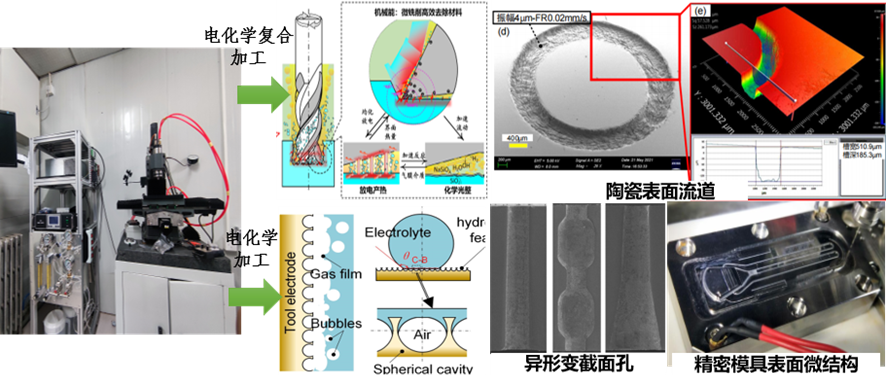 研究了TBC、石英、碳化硅等难加工材料的电化学放电复合加工技术。揭示了电化学、电场与机械多能场耦合作用的材料去除机理。基于多物理场仿真模型,实现了倒锥形孔、竹节形孔等的精密成形和模具微结构的表面光整一体化加工。