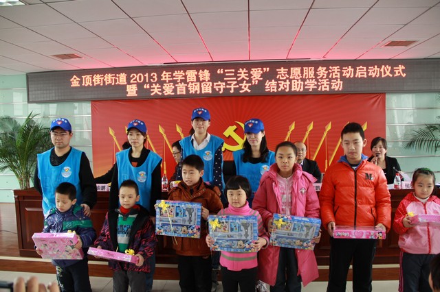 3月2日,pg国际电子网站志愿者来到北京市石景山区金顶街街道,在“关爱首钢子女,给留守儿童送温暖”献爱心活动中,将募集到的慰问品赠送给了那里的孩子们,鼓励他们好好学习,努力成才为祖国建设做贡献。3月5日,“首钢关爱”项目推进暨“学雷锋”青年志愿服务活动启动仪式在石景山区老山街道活动中心隆重举行,志愿者们现场接受了由石景山团区委赠送的锦旗。自首钢集团搬迁以来,由于首钢职工工作时间忙碌和地点远离家庭,很多首钢子女成为了留守儿童。2012年5月起,pg国际电子网站的众多志愿者积极参加“首钢关爱”行动,用自己的青春活力感染小朋友,把自己的知识传递给小朋友,积极关注和引导孩子们健康成长,得到了当地群众的高度评价。