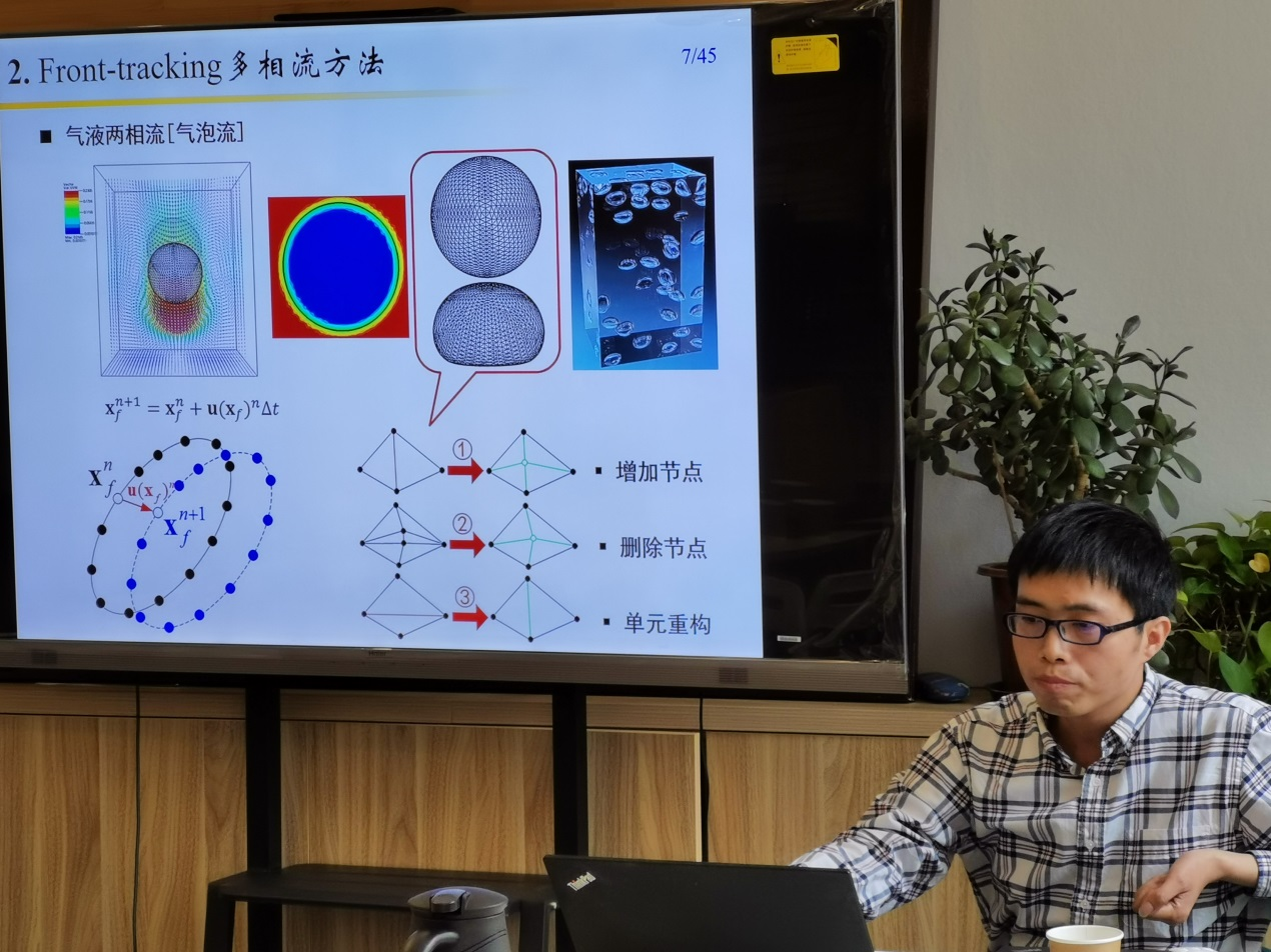 随后,青年教师代表夏焕雄就“增材制造工艺介观尺度多相流-多场耦合建模仿真”与青年教师进行分享交流。夏焕雄介绍了界面追踪法求解多相流的方法在增材制造领域的应用,参会教师认真听取了报告,并就夏焕雄老师的研究方向和潜在合作领域进行了充分的交流和研讨。