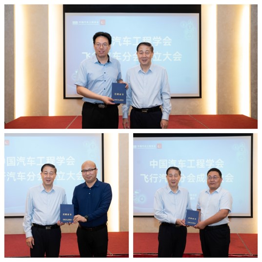 公维洁代表中国汽车工程学会为飞行汽车分会主任委员、常务副主任委员、副主任委员颁发聘任证书。