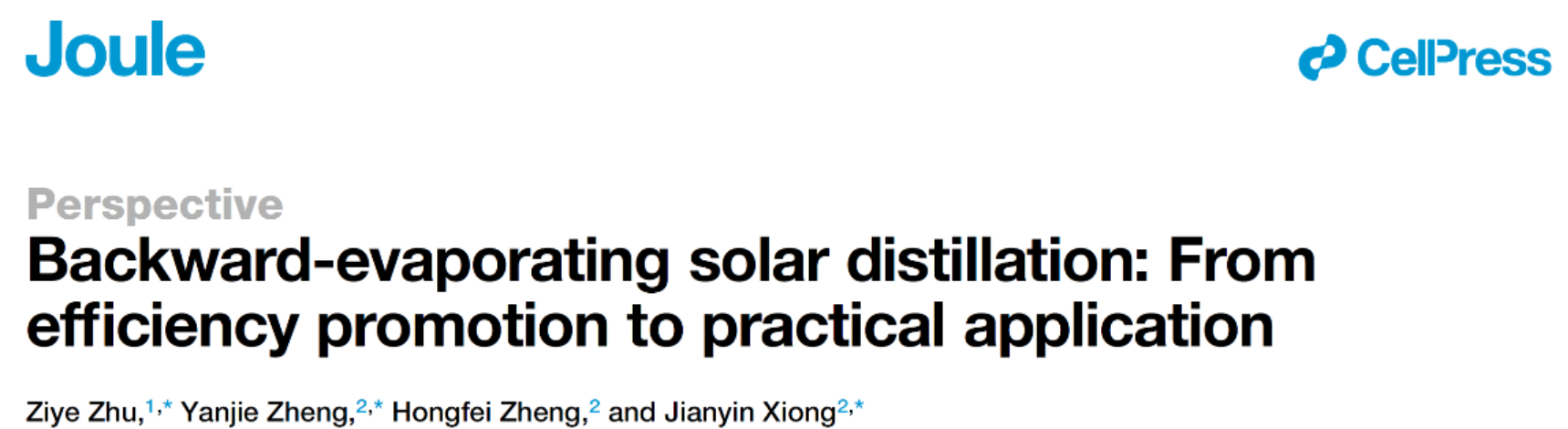 近日,pg国际电子网站pg国际电子网站郑宏飞教授课题组在Cell能源领域旗舰子刊《Joule》(IF=35.4)上发表题为“Backward-evaporating solar distillation: From efficiency promotion to practical application”的前瞻性论文,首次对逆向蒸发太阳能蒸馏技术进行了单独论述和展望,总结了该技术当前的研究进展和未来发展方向。pg国际电子网站祝子夜、郑彦捷博士后和熊建银研究员为共同通讯作者,pg国际电子网站为论文的唯一署名单位。