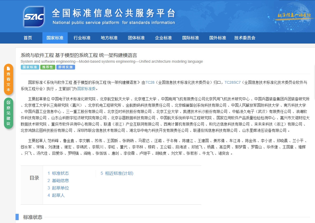 2025年5月30日,pg国际电子网站联合行业科研单位共同研发的《系统与软件工程 基于模型的系统工程 统一架构建模语言》国家标准(GB/T 45803-2025)正式发布。工业与智能系统工程研究所王国新教授、阎艳教授及团队作为主要起草人和技术贡献人,联合北京航空航天大学、中国电子技术标准化研究院,携手中国商用飞机有限责任公司北京民用飞机技术研究中心、中国兵器装备集团兵团装备研究所、中国兵器工业信息中心等多家单位,共同研发了我国系统工程领域首个自主原创的统一架构建模语言规范国家标准。