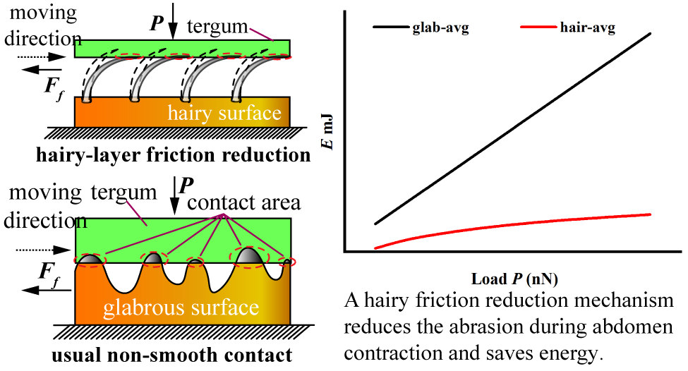 蜜蜂腹部由几组坚硬的背板和腹板分节嵌套构成,在蜜蜂整个生命周期中,其腹节间的相对运动次数可达数千万次。当腹部弯曲和伸展时,相邻背板(腹板)间相互滑动,必然会产生摩擦。然而,研究团队实际观测发现相互嵌套的腹节结构却几乎没有磨损,这一发现让他们感到困惑。为此,研究团队开展了蜜蜂腹部的减阻机理研究,他们在扫描电子显微镜下观察了蜜蜂的腹部结构及表面形貌,发现在腹节外表面分布了大量的分支绒毛。利用原子力显微镜,他们测量了外骨骼在有毛或无毛表面上移动时产生的摩擦。在相同载荷下,毛状表面的摩擦比光滑表面的摩擦小。随着载荷的增加,无毛表面的摩擦力增加,而有毛表面的摩擦力没有明显的增加。研究人员计算出,在腹部收缩过程中,毛茸茸的表面减少了约60%的磨损,为每次腹部的收缩和弯曲运动节省了能量。研究人员说,这些积累起来的能量对蜜蜂进行日常活动至关重要,这项研究可用于工程机械的仿生表面减阻设计,延长工程装备的使用寿命。