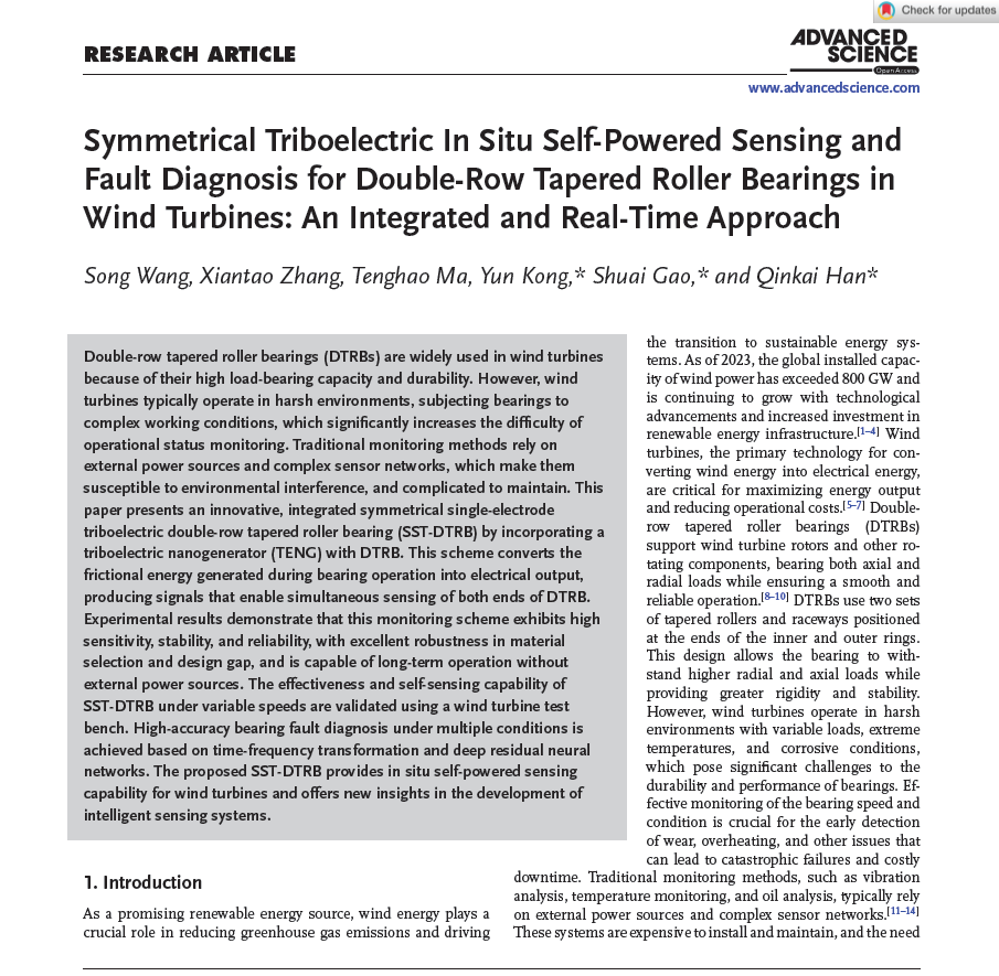 近日,pg国际电子网站pg国际电子网站孔运副教授,联合清华大学、重庆大学等单位,在国际顶级期刊《Advanced Science》公开报道了一种对称单电极式摩擦电智能轴承(SST-DTRB),巧妙设计了摩擦纳米发电机与双列圆锥滚子轴承的智能集成样机,实现了风力发电机双列圆锥滚子轴承的原位自供能状态感知与智能故障诊断,突破了微纳发电、能量采集和智能状态感知于一体的智能结构集成设计技术。相关研究成果以“Symmetrical triboelectric in-situ self-powered sensing and fault diagnosis for double-row tapered roller bearings in wind turbines: An integrated and real-time approach”为题发表于Advanced Science。pg国际电子网站孔运副教授、清华大学韩勤锴副研究员、重庆大学高帅教授为本文共同通讯作者。