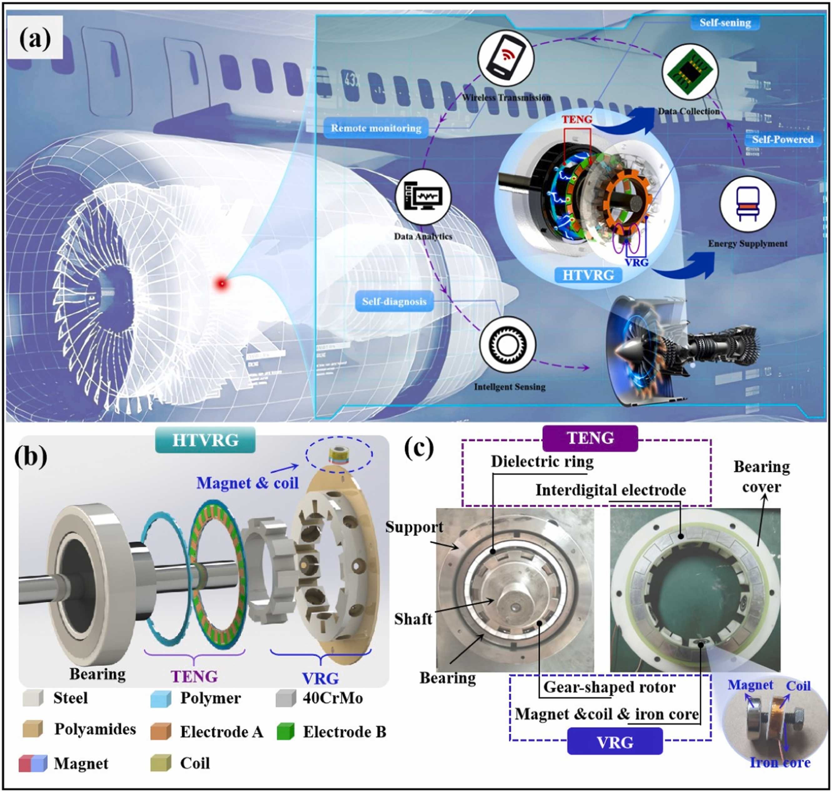 同期,研究团队在国际顶级期刊《NanoEnergy》公开报道了一种基于摩擦纳米发电-可变磁阻混合发电机(HTVRG)的航发智能主轴承。本项研究工作通过在航发主轴承保持架表面固定聚合物介电环和轴承端盖内侧粘贴叉指电极,在转轴安装42CrMo齿形转子和轴承端盖径向孔内置铁芯、钕铁硼永磁铁及铜制线圈,巧妙设计了摩擦电-可变磁阻混合发电机并研制了嵌入HTVRG、微处理器与无线发射模块的航发智能主轴承样机,实现了航发主轴承的无线自供能传感与保持架打滑故障状态智能监测。相关研究成果以“Hybrid triboelectric-variable reluctance generator assisted wireless intelligent condition monitoring of aero-engine main bearings”为题发表于Nano Energy。pg国际电子网站孔运副教授为本文共同通讯作者。